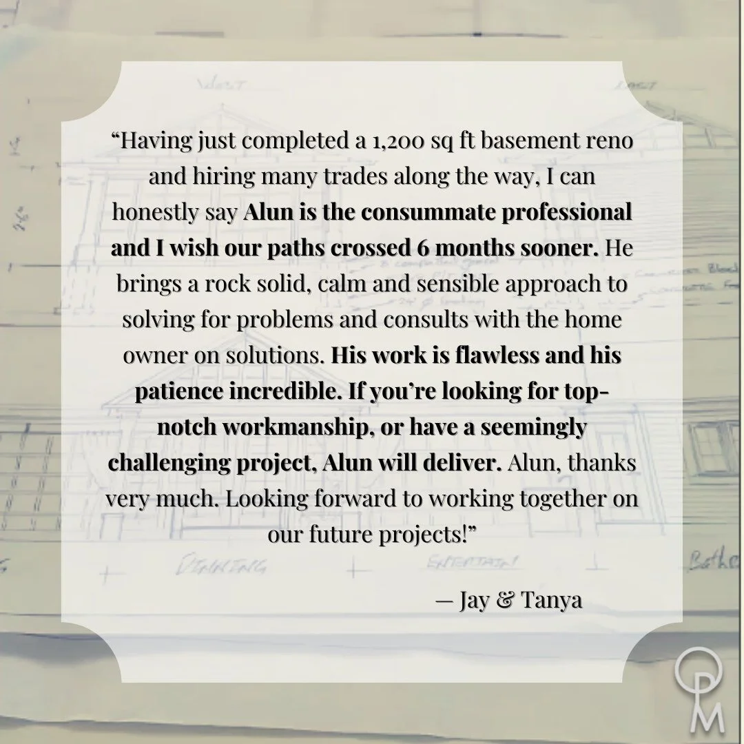 “Having just completed a 1,200 sq ft basement reno and hiring many trades along the way, I can honestly say Alan is the consummate professional and I wish our paths crossed 6 months sooner. He brings a rock solid, calm and sensible approach to solving for problems and consults with the home owner on solutions. His work is flawless and his patience incredible. If you’re looking for top-notch workmanship, or have a seemingly challenging project, Alan will deliver. Alan, thanks very much. Looking forward to working together on our future projects!”